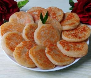 - Ambil adonan secukupnya, bentuk bulat pipih (diameter 5 cm), letakkan di cetakan, tutup dan panggang hingga kecokelatan (3-5 menit per sisi); balik hati-hati agar empuk.