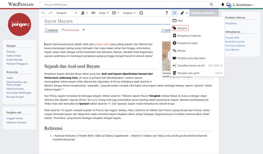 Untuk menambahkan kategori pada sebuah artikel, buka artikel yang dimaksud dan masuk ke mode suntingan. Setelah itu, klik ikon tiga garis di pojok kanan atas, kemudian pilih menu Kategori.