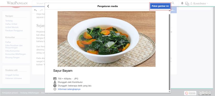 Setelah itu, akan ditampilkan informasi mengenai gambar yang telah berhasil diunggah. Apabila gambar tersebut akan digunakan dalam artikel, silakan klik tombol "Pakai gambar ini" yang terletak di bagian kanan atas.