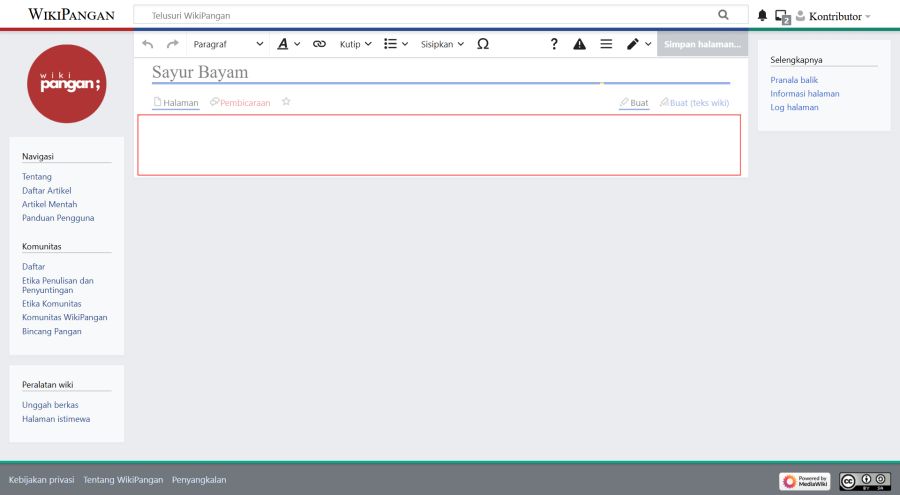 Untuk membuat artikel baru di WikiPangan, pengguna dapat memulai dengan mengklik kolom pencarian yang terletak di bagian atas halaman, kemudian mengetikkan judul artikel yang ingin dibuat. Jika artikel dengan judul tersebut belum tersedia, sistem akan menampilkan opsi untuk membuat halaman baru dengan judul yang dimaksud.