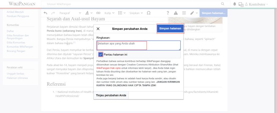 Setelah artikel selesai dibuat, pengguna diwajibkan untuk menyimpan perubahan dengan menekan tombol Simpan halaman yang terletak di bagian kanan atas halaman.