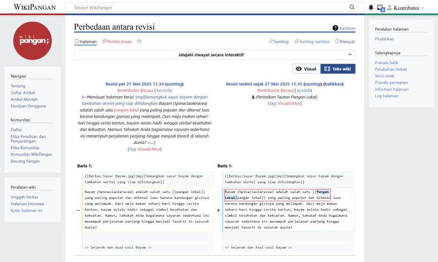 Pengguna dapat melihat perbandingan antara dua versi artikel yang ditampilkan secara berdampingan, dengan versi yang lebih lama di sebelah kiri dan versi yang lebih baru di sebelah kanan. Perbedaan atau perubahan antar versi akan disorot dengan warna biru untuk memudahkan identifikasi.