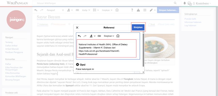 Selanjutnya, tentukan kata atau kalimat dalam artikel yang akan dirujuk, kemudian sisipkan kode <ref> setelah bagian tersebut. Setelah itu, akan muncul jendela isian untuk menambahkan informasi rujukan.
