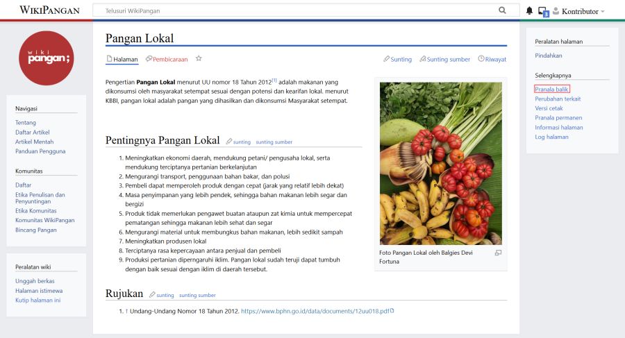 Pranala Balik (Back Link) merupakan tautan pada suatu situs web yang mengarah ke halaman atau artikel lain dalam situs tersebut. Di WikiPangan, untuk mengetahui ke halaman mana saja sebuah artikel ditautkan, pengguna dapat menggunakan menu Pranala balik yang tersedia di setiap halaman artikel. Sebagai contoh, untuk mengetahui di artikel mana saja Makanan Pokok disebut atau ditautkan, klik menu Pranala balik yang terletak di sisi kanan halaman artikel tersebut.