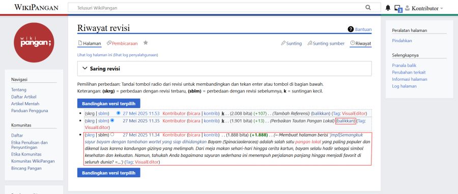 Untuk membandingkan dua versi artikel, pilih versi-versi yang ingin dibandingkan dengan memilih kotak di samping masing-masing revisi, kemudian klik tombol Bandingkan versi terpilih.