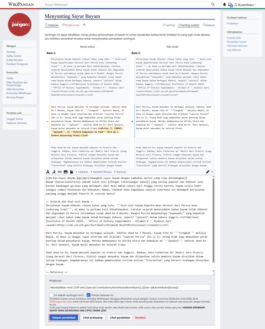 Pengguna dapat meninjau riwayat penyuntingan suatu artikel serta mengembalikannya ke versi sebelumnya dengan mengklik tombol Riwayat yang terletak di bagian atas halaman artikel. Pada bagian Riwayat, pengguna dapat melihat daftar revisi yang telah dilakukan terhadap artikel tersebut, beserta informasi mengenai kontributor yang melakukan penyuntingan.