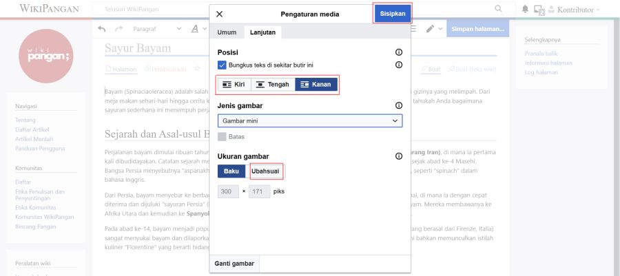 Pada tab Lanjutan, posisi dan ukuran gambar dapat disesuaikan sesuai kebutuhan. Untuk mengubah ukuran gambar secara manual, pilih opsi Ubahsuai, kemudian masukkan ukuran yang diinginkan. Setelah seluruh pengaturan selesai dilakukan, klik tombol Sisipkan yang terletak di bagian kanan atas.
